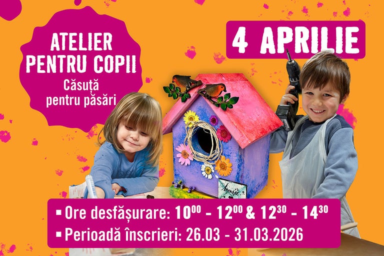 Atelierul pentru copii este un workshop în cadrul căruia micii participanți vor construi/bricola un aranjament sau obiect, conform instrucțiunilor de la fața locului. Scopul final este realizarea unei căsuțe pentru păsări.