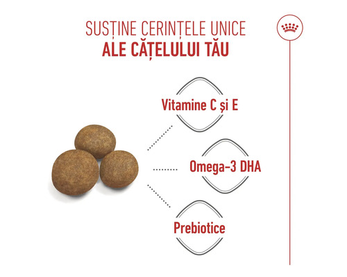 - AlcătuireCompoziție: Proteine de carne de pasăre deshidratată, făină de porumb, orez, proteine de carne de porc deshidratată*, grăsimi animale, porumb, gluten de grâu*, făină de grâu, proteine animale hidrolizate, săruri minerale, pulpă de sfeclă, gluten de porumb, fibre vegetale, ulei de soia, ulei de peşte, fructo-oligozaharide, tegumente și semințe de psyllium, drojdie hidrolizată (sursă de mano-oligozaharide şi beta glucani) (0,30%), ulei de alge Schizochytrium sp. (sursă de DHA), suc de Yucca Schidigera, făină din crăiţe, glucozamină obținută prin fermentație, cartilaj hidrolizat (sursă de condroitină).
