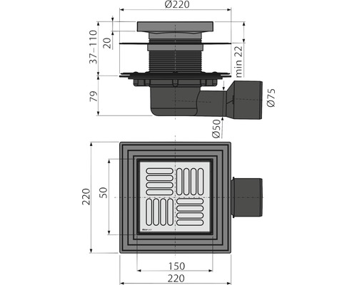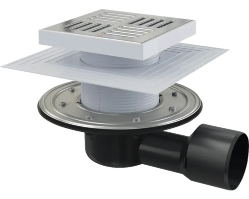 Sifon polipropilenă terasă Komfort by Alca APV3444 grătar oțel inoxidabil 105x105 mm ieșire orizontală Ø 50/75 mm