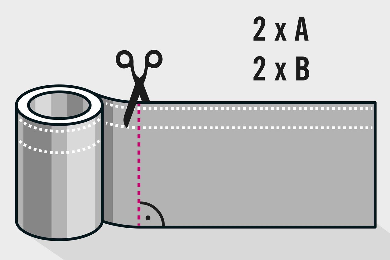 Mai întâi, măsurați lungimea (A) și lățimea (B) patului care trebuie protejat. Adăugați 8 cm la lungimea „A” și 10 cm la lățimea „B”. Apoi tăiați câte două fâșii de fiecare lungime din rolă, folosind o foarfecă. Tăieturile trebuie făcute în unghi drept.