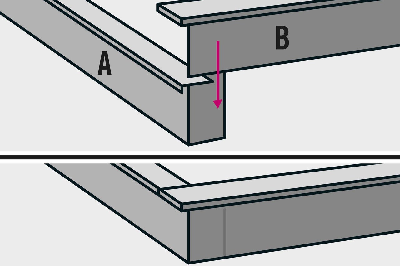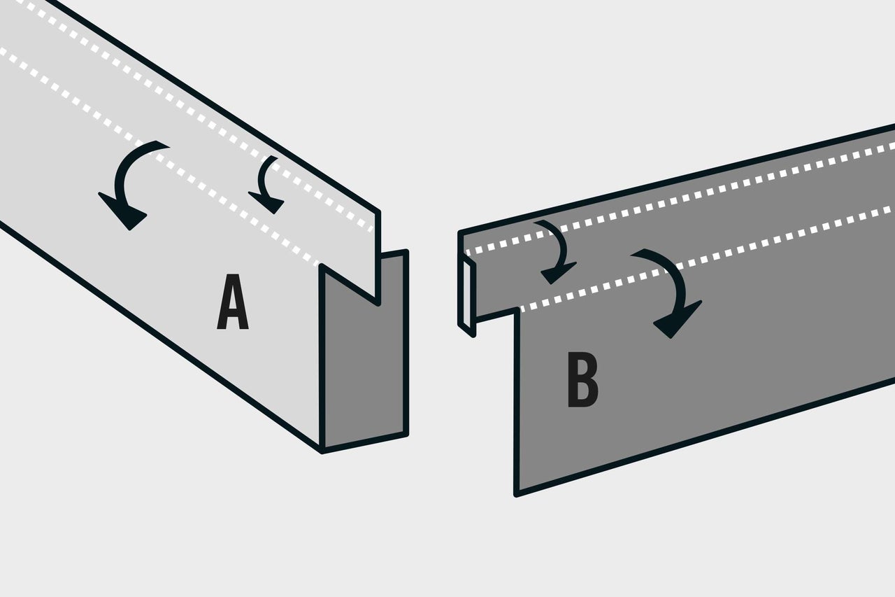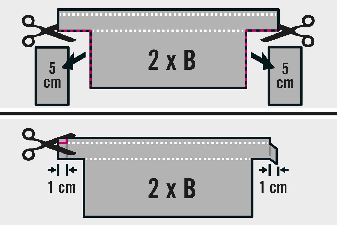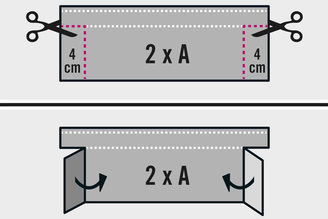 Folia este deja perforată în punctele corespunzătoare, astfel încât să poată fi îndoită cu ușurință acolo. Cele două semifabricate din folie „A” sunt acum tăiate la 4 cm pe ambele părți, la perforația inferioară. Îndoiți secțiunile tăiate înainte, la un unghi drept.