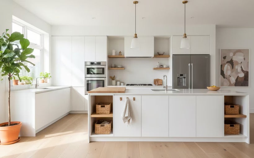- Bucătăria: Mobilierul alb "Cloud Dancer" este ideal pentru dulapuri și fronturi de sertare, fiind ușor de asortat atât cu blaturi din lemn natural, cât și cu suprafețe din piatră sau sticlă. O insulă de bucătărie în această culoare va adăuga luminozitate și rafinament. Completați cu plante verzi sau accesorii din fibre naturale pentru un aspect cald, contemporan.