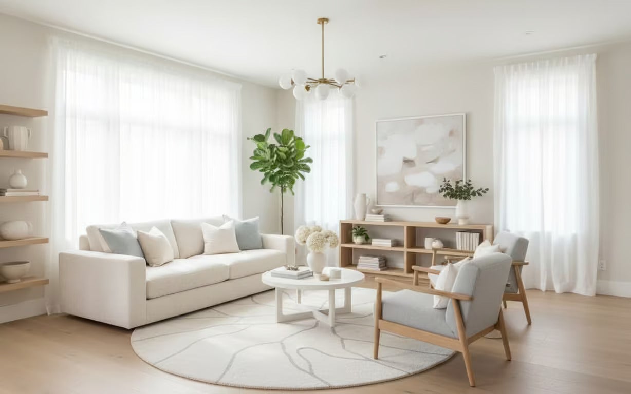 Dacă doriți să aduceți căldură în amenajare, combinați albul cu nuanțe naturale precum bej, maro deschis, nisipiu sau tonuri de cappuccino, alături de finisaje din lemn natural. Cloud Dancer temperează aceste culori calde și le oferă un fundal aerisit, prevenind încărcarea vizuală a spațiului.