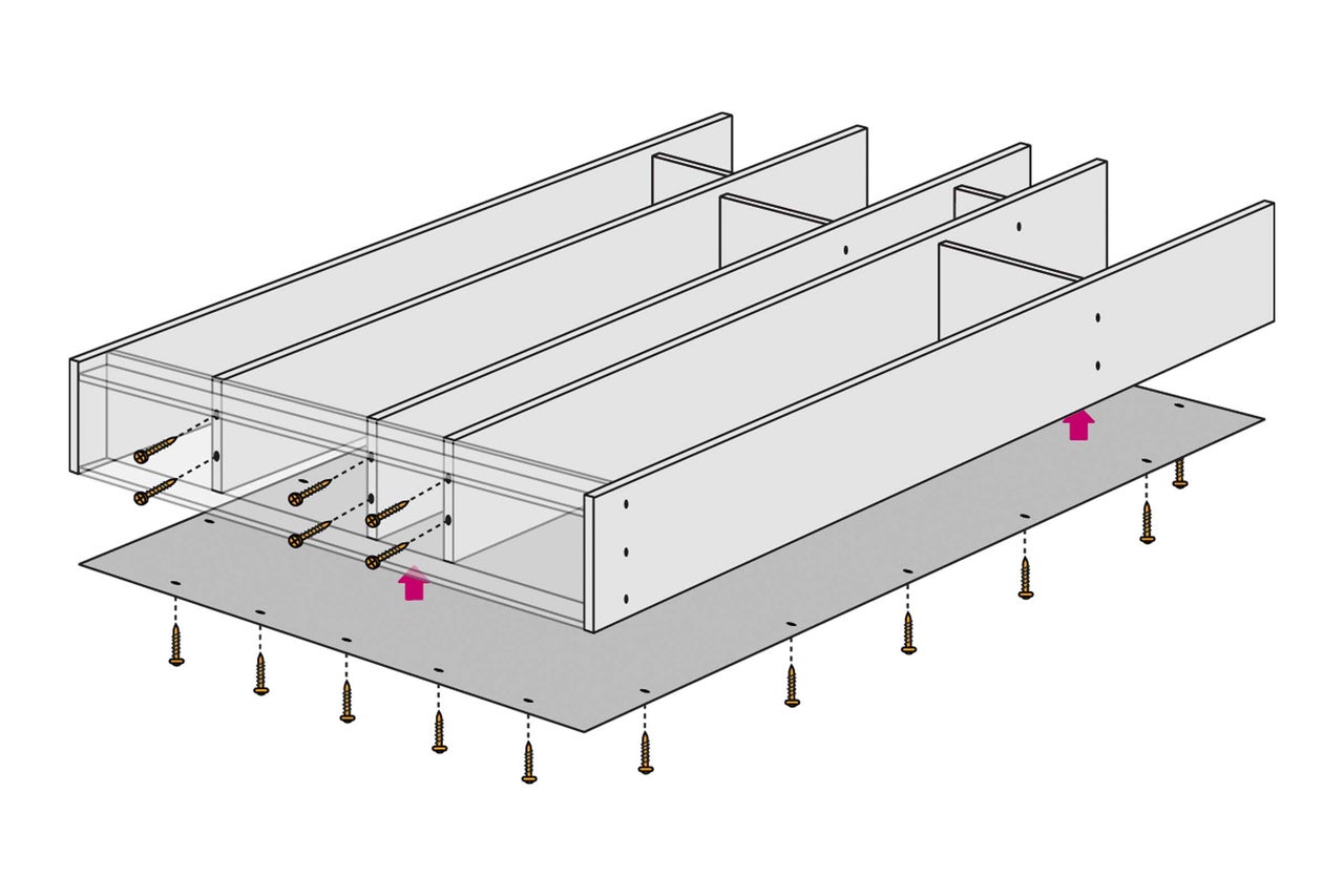 - Poziționare: Așezați panoul de bază peste cele două suporturi (socluri). În partea din spate, acestea trebuie să fie la nivel, iar în față încastrate cu 2 cm.