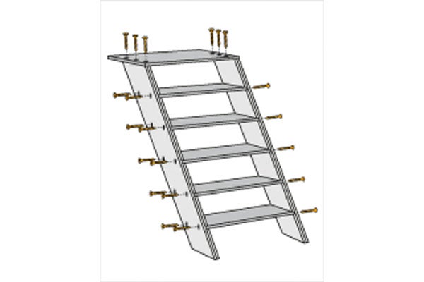 Fixare: aliniați treptele pe exterior și înșurubați fiecare treaptă la laterale cu câte două șuruburi universale (4 x 40 mm).