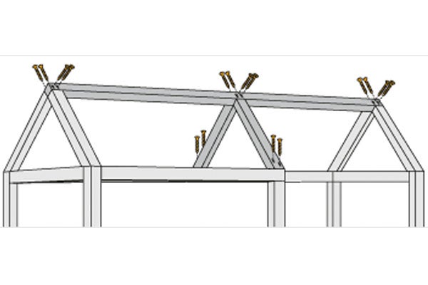 - Grinzile acoperișului: așezați două grinzi (tăiate la 45° pe o parte) pe montanți, formând un triunghi.