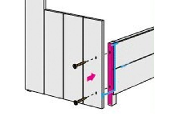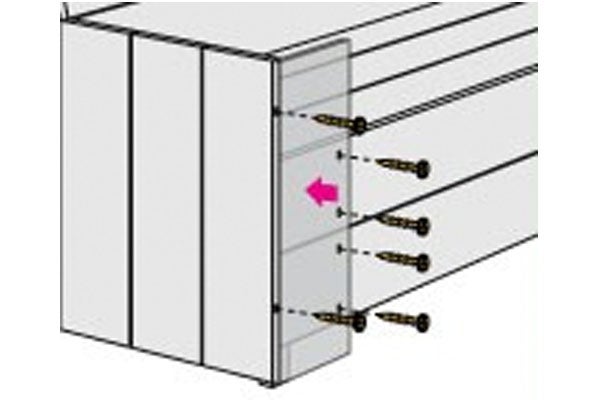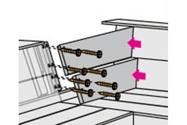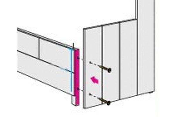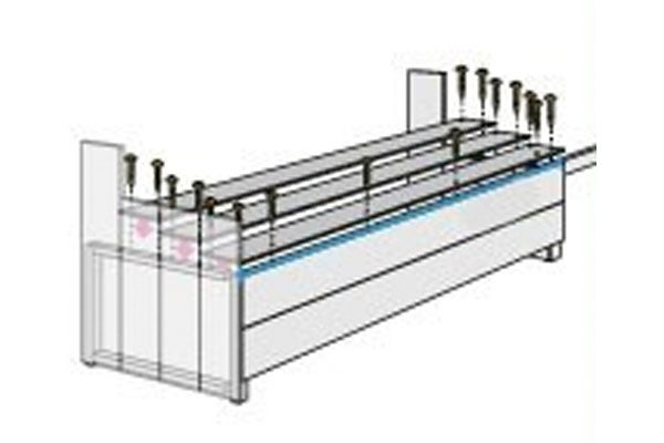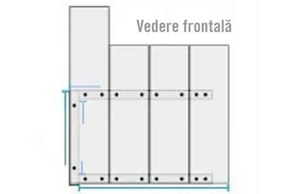 - Panouri superioare: Instalați panoul lung și apoi cel scurt deasupra. Atașați o piesă profilată pe spatele panourilor superioare, înclinată spre interior cu 2.7 cm, și înșurubați-o cu 8 șuruburi universale.