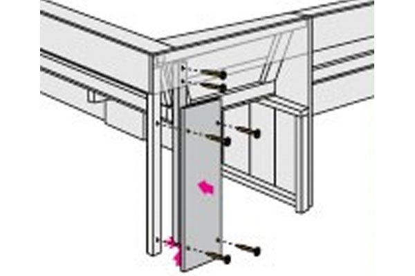 - Picior față: Plasați primul picior pentru îmbinarea de colț în față, în colțul structurii, aliniat cu panoul și cu partea superioară a șezutului. Înșurubați-l pe panourile secțiunii inferioare cu două șuruburi universale.