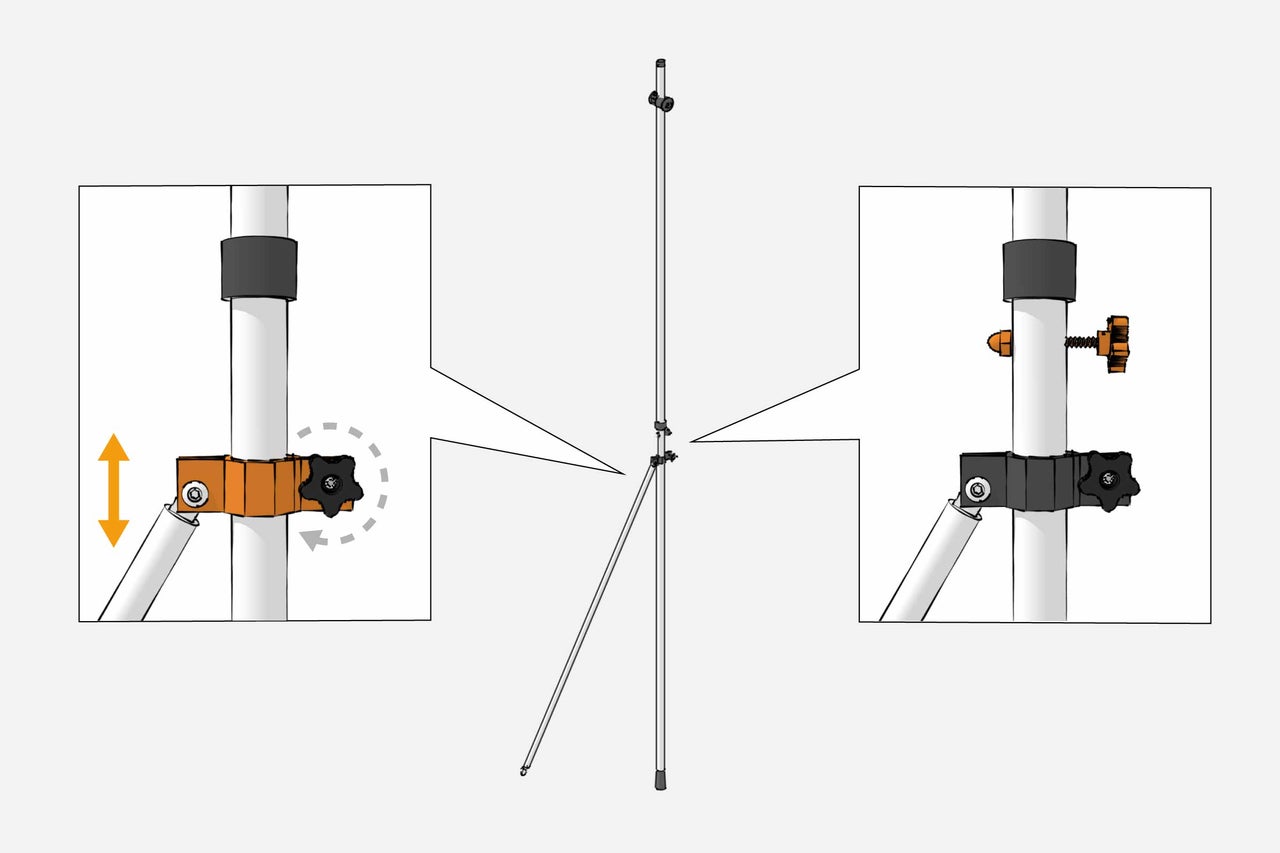 Introduceți stâlpul umbrelei în suportul clemei și strângeți clema finală.