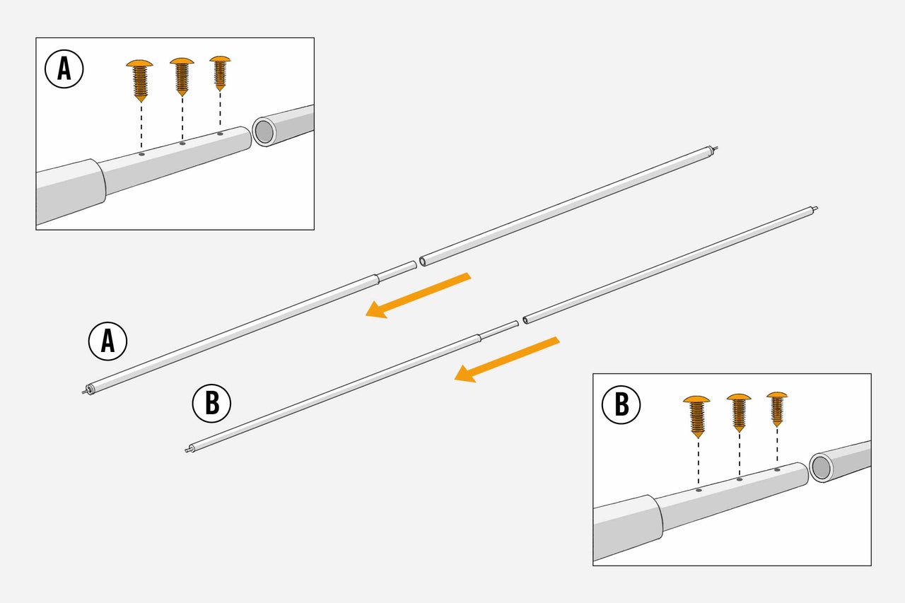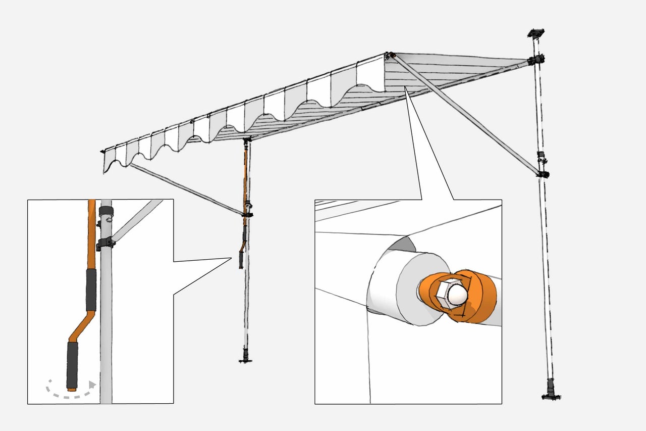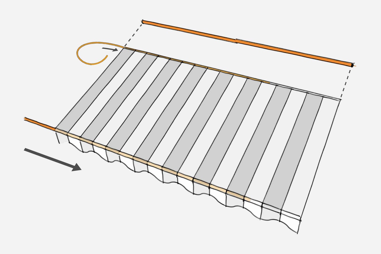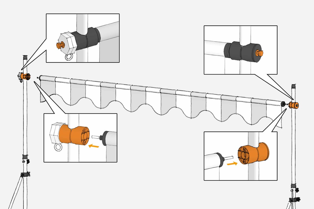 Introduceți stâlpul frontal în manșonul frontal al copertinei. Rulați cu grijă copertina pe tubul rulant.