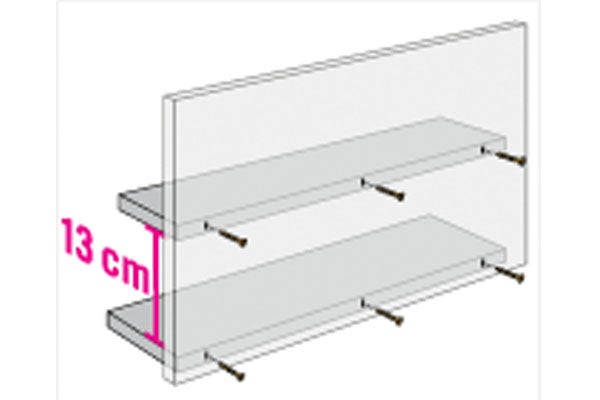 - Raftul superior: Instalați-l central, la o distanță de 13 cm deasupra primului raft, respectând aceeași metodă de înșurubare.