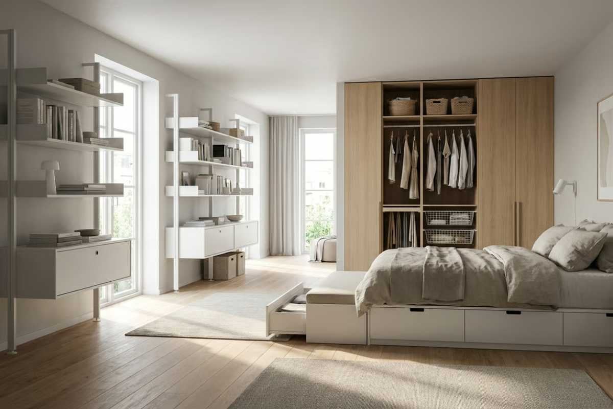 - Combinarea soluțiilor de depozitare: Rafturile deschise sunt ideale pentru cărți și decorațiuni frumoase, însă alternați-le cu dulapuri închise unde puteți ascunde obiectele mai puțin estetice. Valorificați spațiul de sub pat cu sertare glisante sau cutii cu roți pentru depozitare suplimentară.